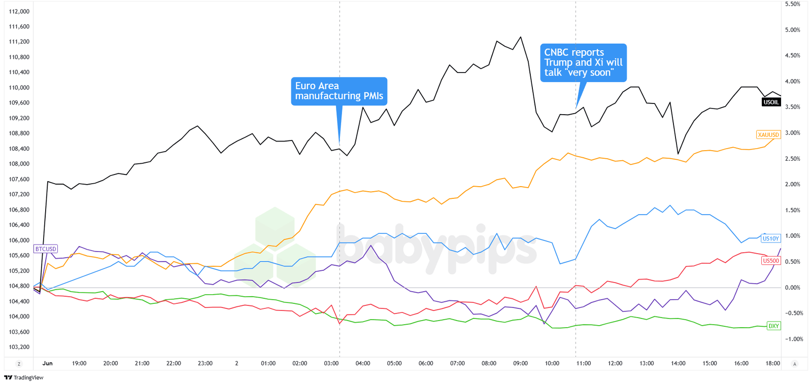Manufacturing data globally painted a mixed picture. U.S. ISM manufacturing PMI slipped to 48.5 in May from 48.7, signaling a third straight month of contraction. Japan’s final PMI ticked up to 49.4 from 48.7 but stayed below the key 50 mark. Over in Europe, factory activity showed some signs of life, with the final euro area PMI improving to 49.4, the slowest pace of decline in more than two years. Australia’s PMI stayed in growth mode at 51.0, though it cooled from 51.7.