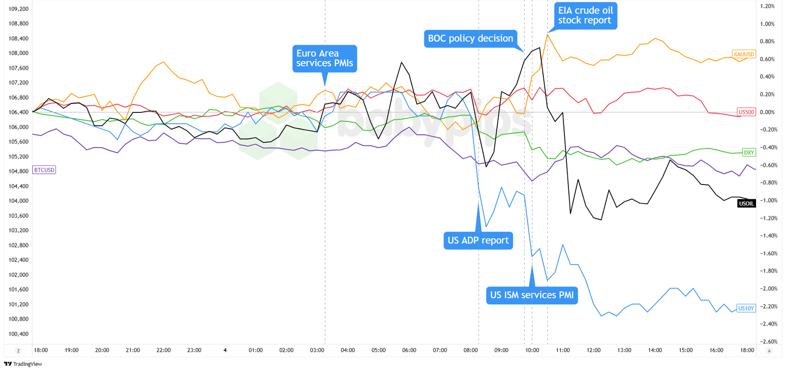 First up, weak U.S. data had traders leaning harder into the idea of Fed rate cuts. The ISM services index slipped into contraction at 49.9 when everyone was looking for a 52.0 print. ADP private payrolls were just plain ugly at 37,000 compared to 115,000 expected.
