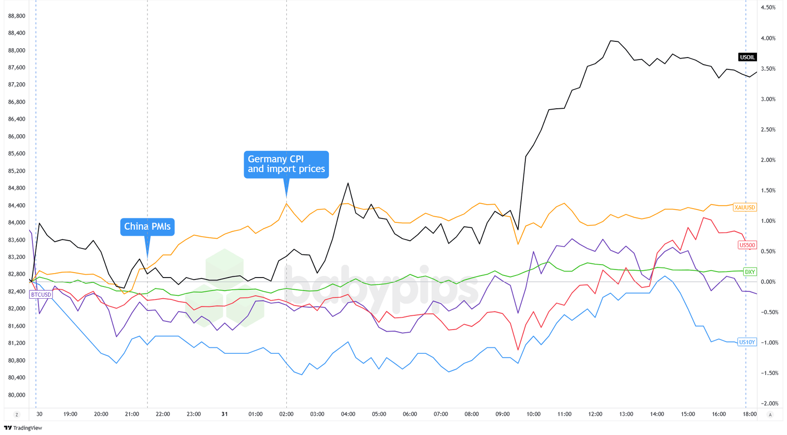 Dollar Index, Gold, S&P 500, Oil, U.S. 10-yr Yield, Bitcoin Overlay Chart by TradingView