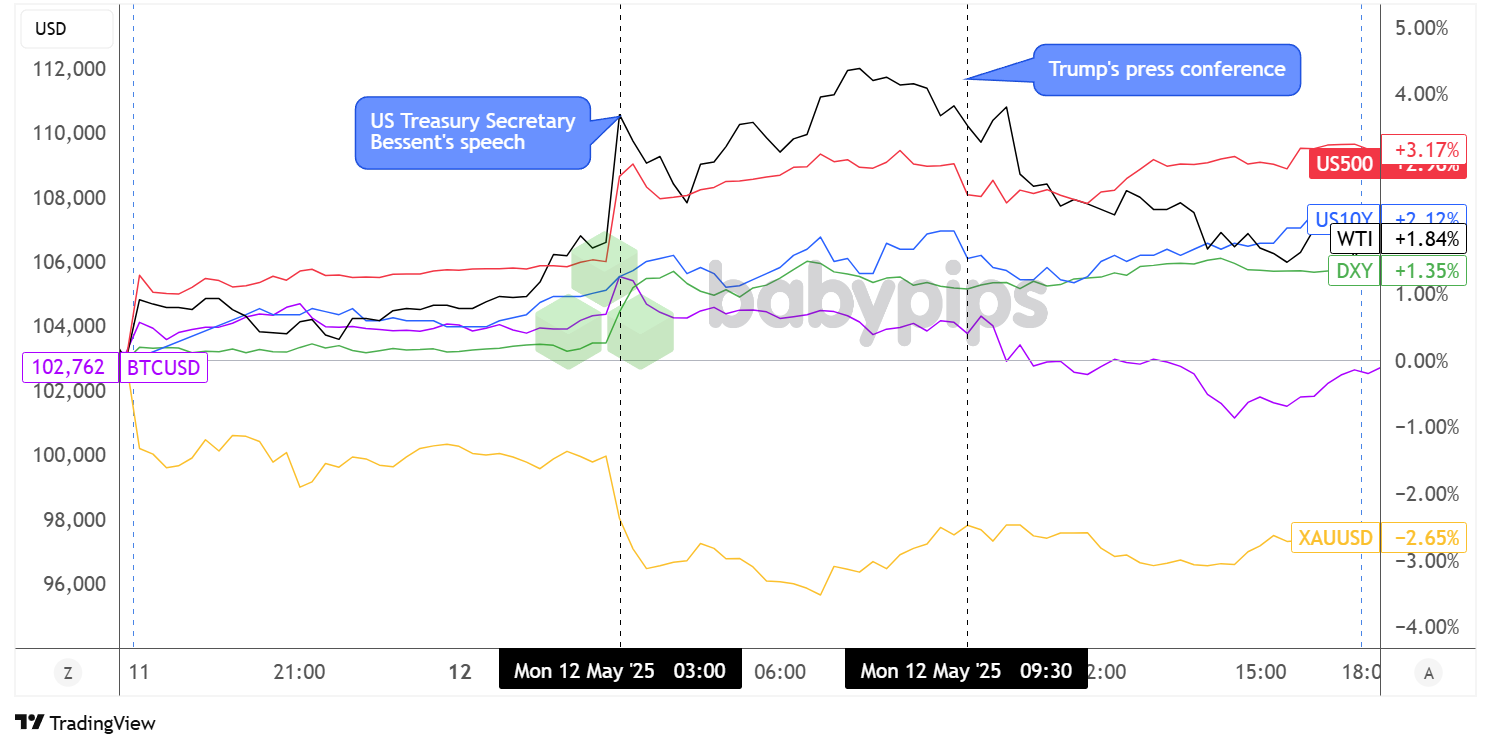 Market participants were biting their nails while waiting for more deets on the weekend talks between the U.S. and China, before risk rallies picked up during Treasury Secretary Bessent’s announcement that they have indeed struck a 90-day agreement to lower tariffs.