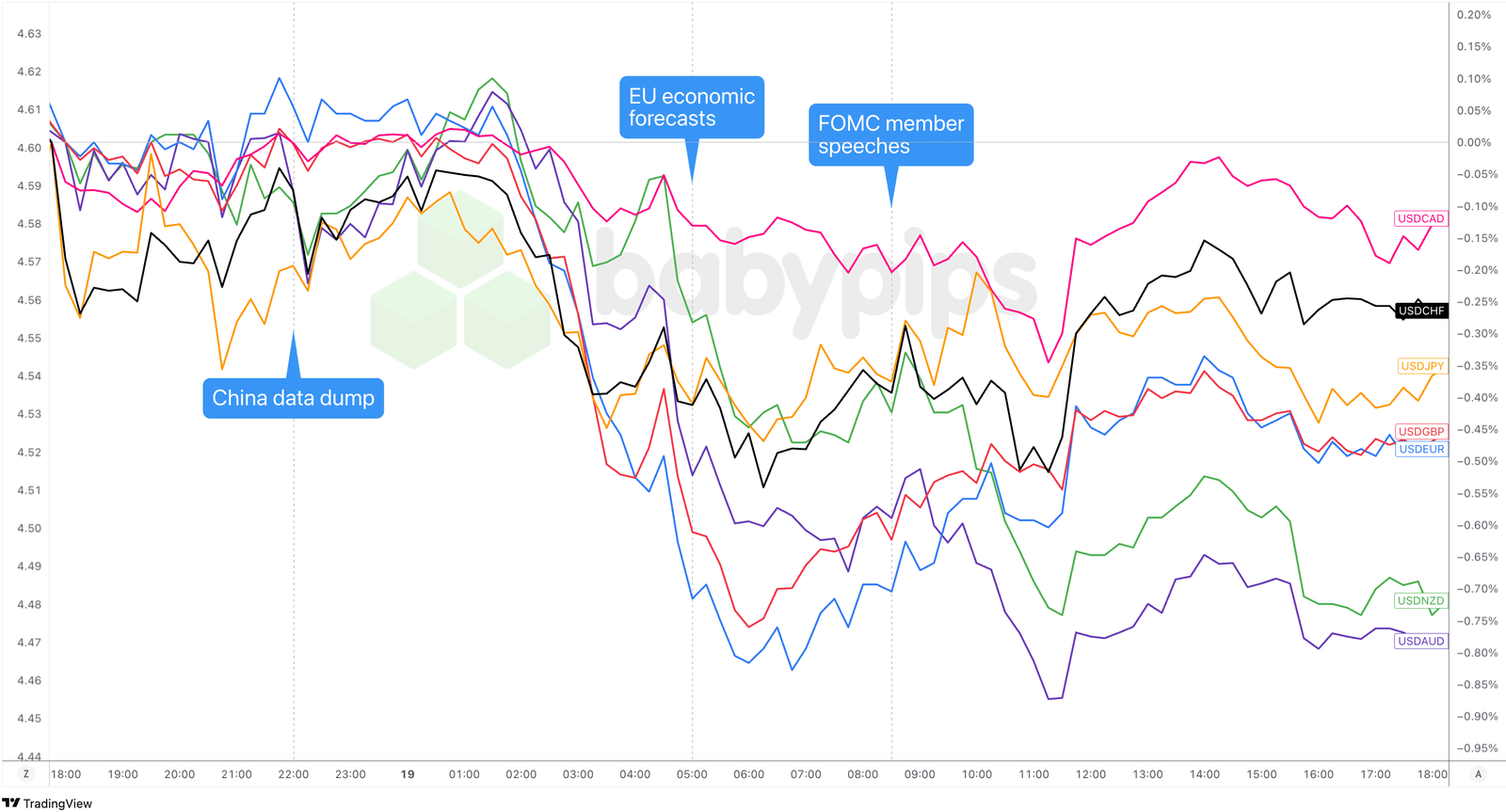 Overlay of USD vs. Major Currencies Chart by TradingView