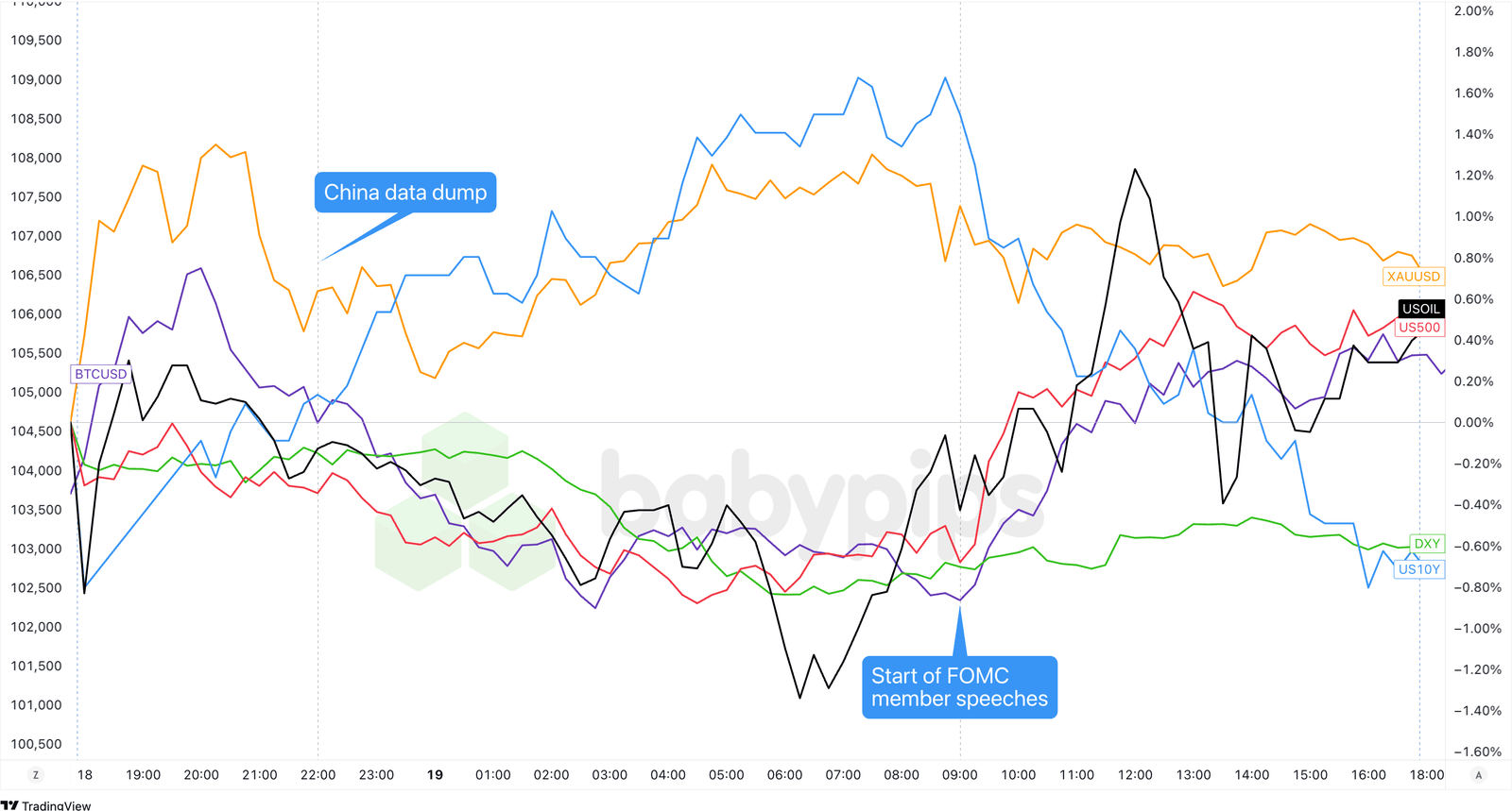 ollar Index, Gold, S&P 500, Oil, U.S. 10-yr Yield, Bitcoin Overlay Chart by TradingView
