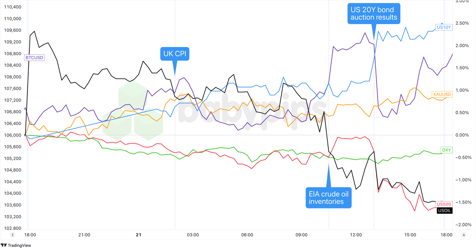 Dollar Index, Gold, S&P 500, Oil, U.S. 10-yr Yield, Bitcoin Overlay Chart by TradingView