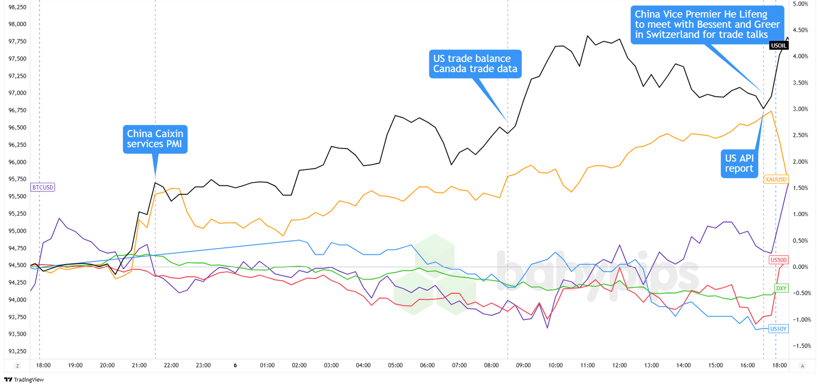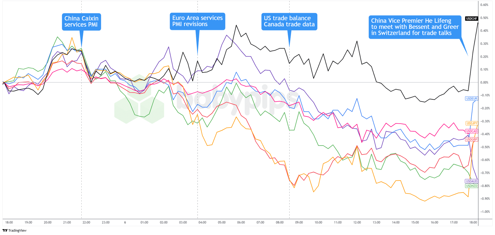 The most dramatic move came near the end of the trading day when news broke that Chinese Vice Premier He Lifeng would meet with U.S. officials in Switzerland. This announcement triggered a sharp upward spike in the dollar, reflecting sudden optimism that trade tensions might ease, and erasing much of the day’s losses in a matter of minutes.