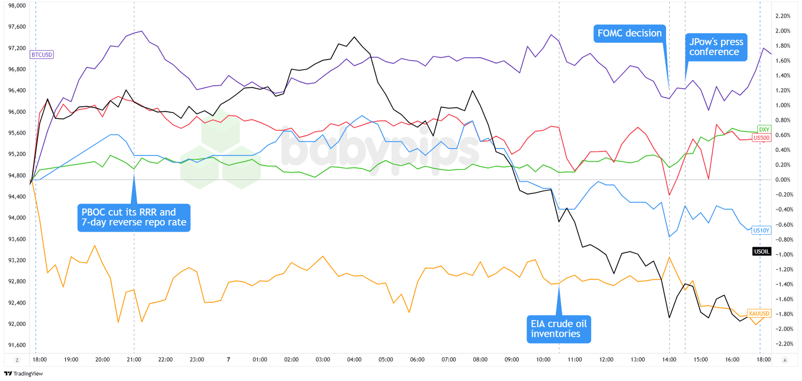Dollar Index, Gold, S&P 500, Oil, U.S. 10-yr Yield, Bitcoin Overlay Chart by TradingView