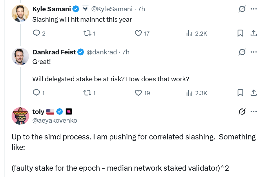 Solana Labs CEO Anatoly Yakovenko said he’s pushing for a “correlated slashing” mechanism, where the penalty would be equal to the square of the difference between a validator’s faulty stake in an epoch and the median network staked validator.