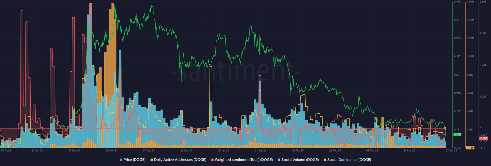 The social dominance trend has also been falling. March was not the most bearish month for DOGE, despite the heavy price losses. Similarly, the social volume also set new lows in April. This meant that unless the price trend changes direction, attention and capital flows will continue to leak out of the market.