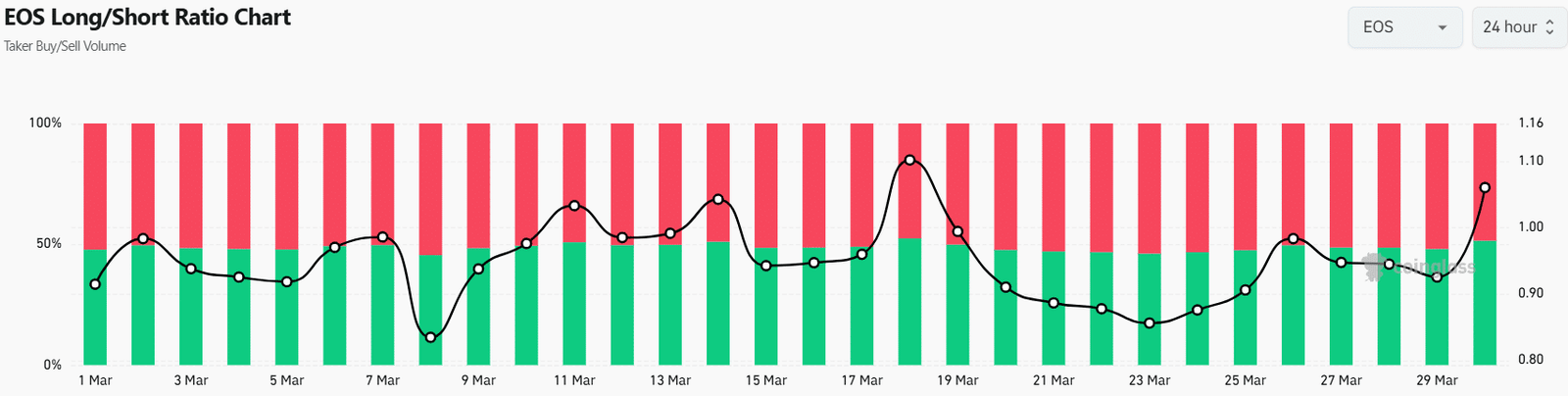 The Long/Short Ratio chart showed that long positions represented 51.4% of the taker volume. The last time it saw such a high ratio was on the 18th of March. On the 19th of March, EOS plunged from $0.67 to $0.56.