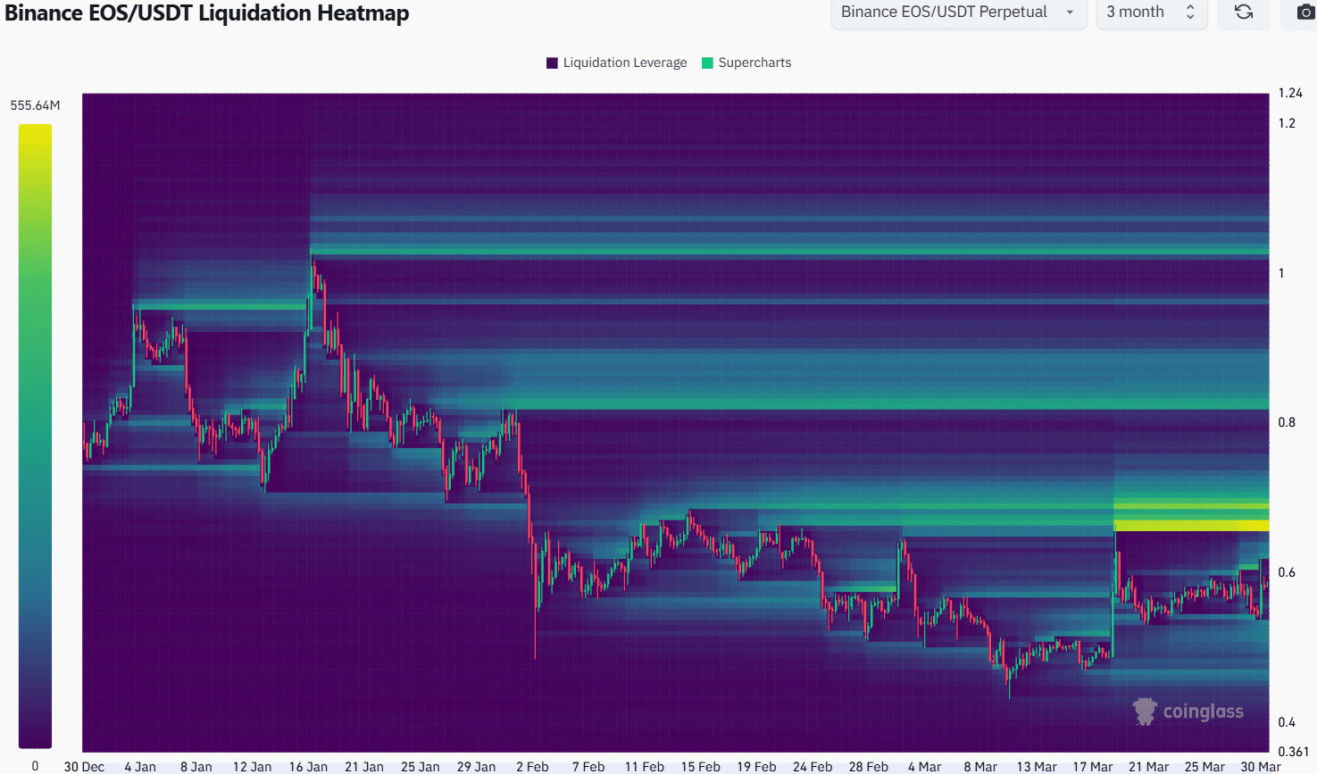 Due to the high long/short ratio, traders should be cautious of going long. A retest of the $0.64-$0.66 area would likely give an opportunity to sell the EOS token.