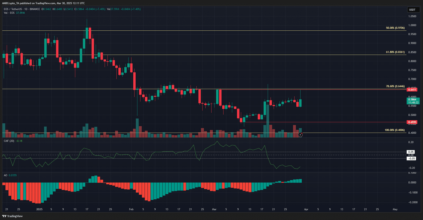 With gains of 5.4% in 24 hours, EOS [EOS] was one of the better-performing altcoins with a sizable market cap. However, it failed to climb above the $0.64 resistance level once again.
