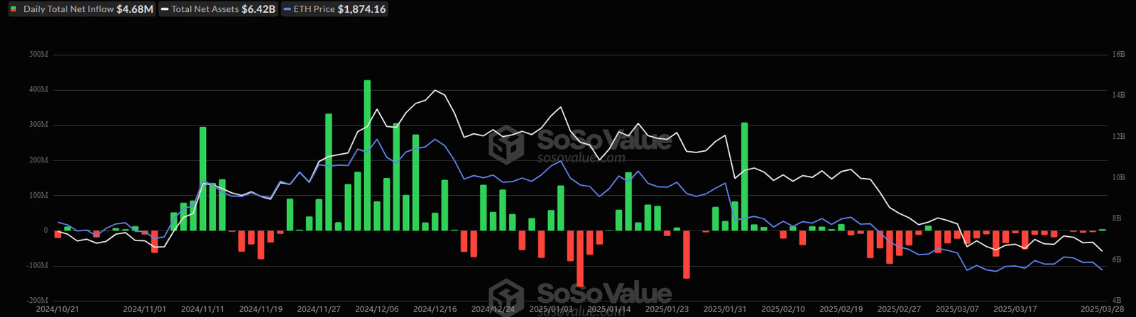 U.S spot ETH ETFs, on the other hand, have recorded consistent outflows since 20 February, apart from only two days of inflows. In March, they saw over $400M in outflows.