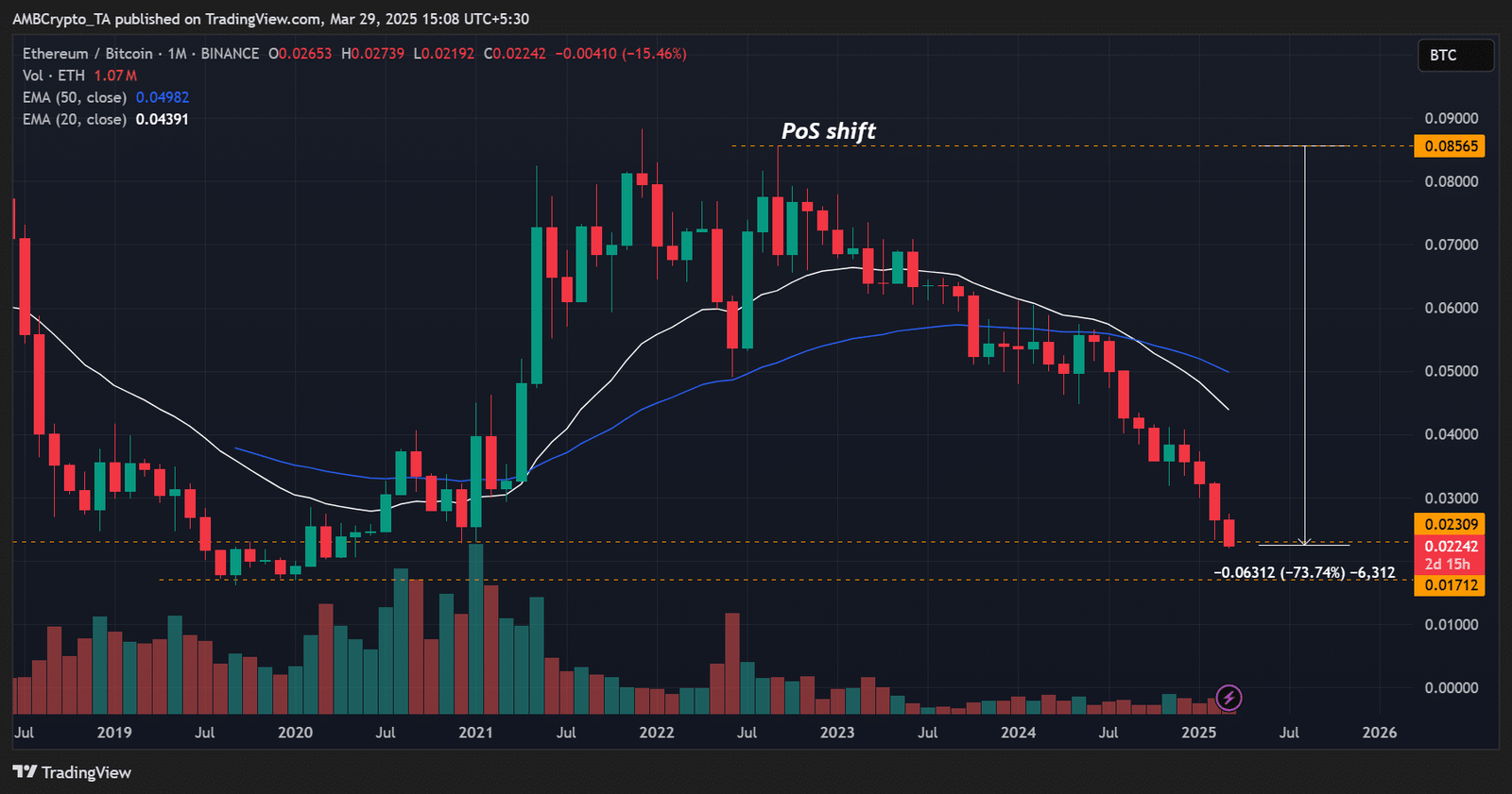 Ethereum [ETH] has weakened against Bitcoin for over three years. This can be best evidenced by the ETH/BTC ratio, a metric which tracks ETH’s relative price performance against BTC. It marked a new low of 0.022 recently.