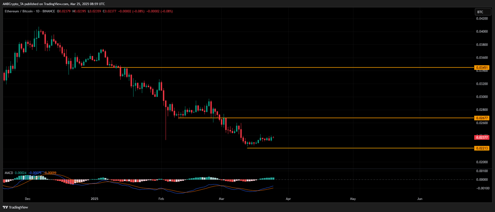 BTC’s current non-linear price action presents ETH with a window to attract capital. The ETH/BTC pair signals growing momentum as the MACD flips bullish for the first time in nearly a month.