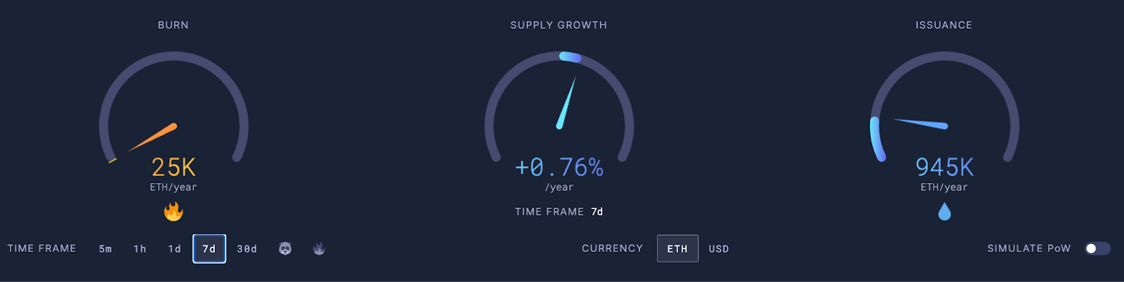 According to data from Ultrasound.money, the projected ETH burn rate has declined to 25,000 ETH/year, and its supply growth has risen to an annual rate of 0.76%, bringing the issuance rate to 945,000 ETH per year.