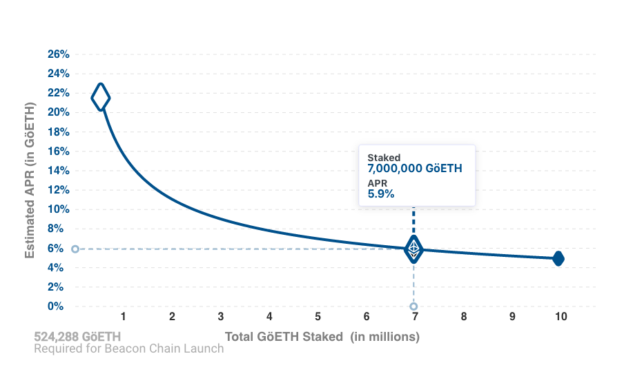 In plain English, if the total amount of ETH staked is low, the annual reward is high, but as the total stake rises, the reward received by each validator starts to fall.