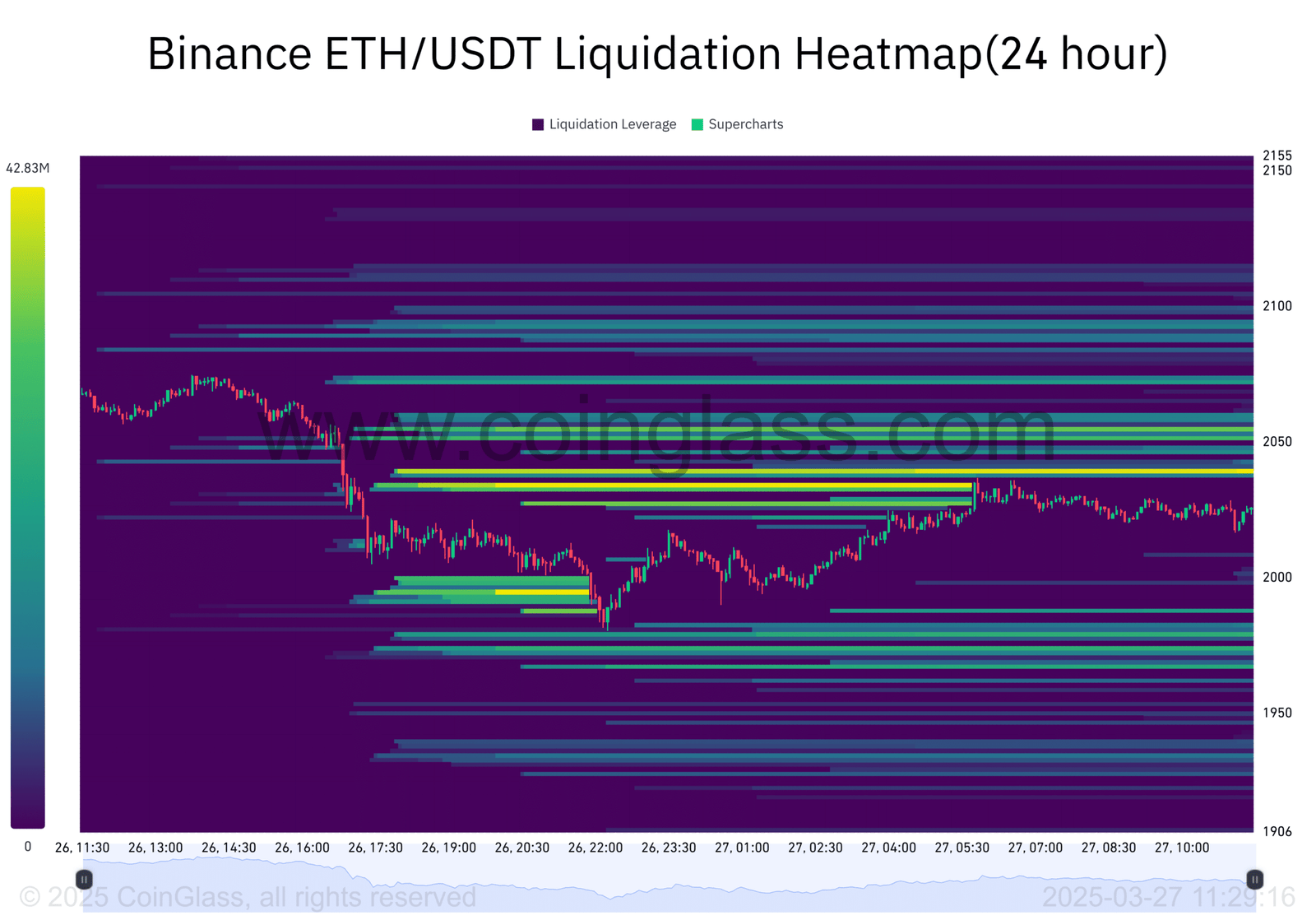The map shows significant liquidation points between $2,000 and $2,100. As Ethereum approaches these levels, forced selling could occur, increasing market volatility.