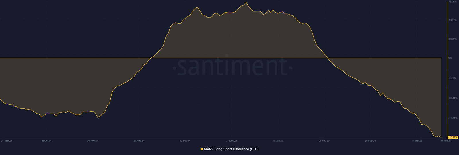 The MVRV Long/Short Difference for ETH stood at -16.91 %. This negative value indicates a bearish sentiment among long-term holders. However, such a significant divergence suggests that the market may be oversold.