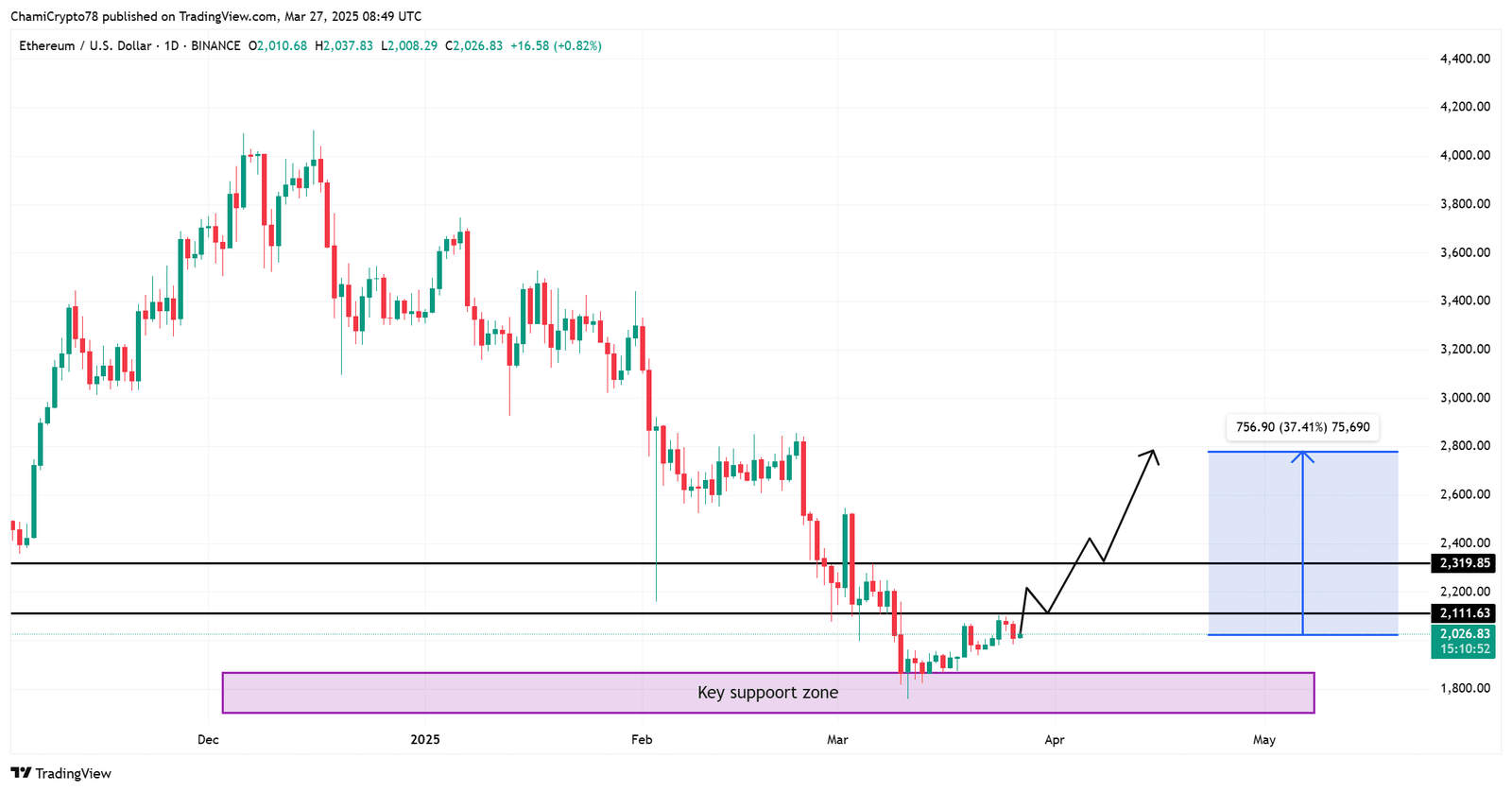 Therefore, a move above this threshold could spark further buying, and the price could even rise by 37%, approaching $2,800.