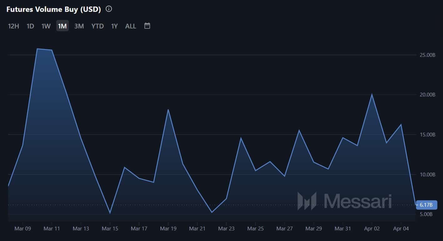 For starters, Ethereum’s futures buy volume has declined to a two-week low of 6.17 billion. This is a drop from 16.25 billion, suggesting that the altcoin is seeing fewer buyers in the market.