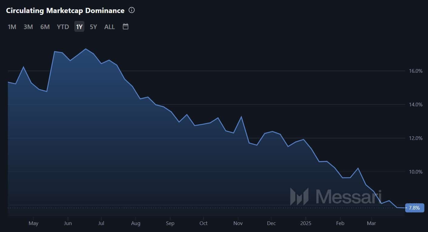This trend is further supported by a drop in Ethereum’s circulating market dominance, which has fallen from 17.32% to 7.39%. Such a significant decline highlights ETH’s underperformance compared to its competitors.