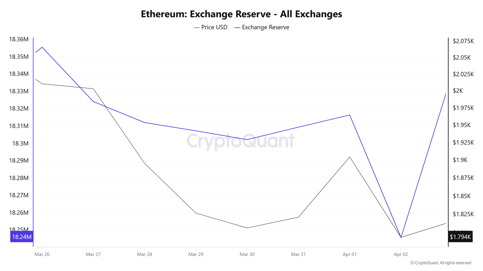 Ethereum’s exchange reserve is increasing, reaching 18.4 million—a rise of 200 million ETH tokens in the past day.