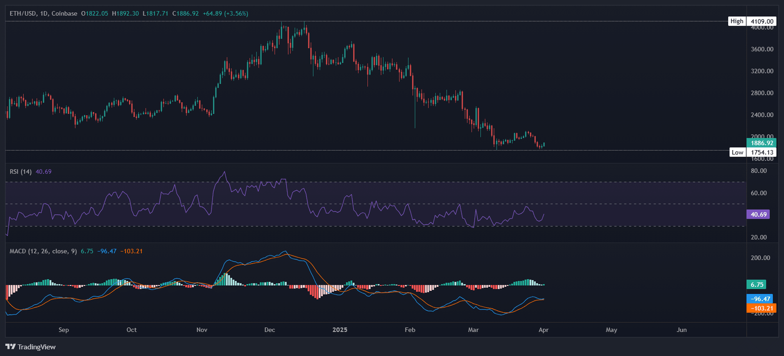 Ethereum is trading at $1,886, up 6% from its lowest point in two days, a level not seen in over four months. With a 23.52% surge in volume to $15.64 billion, this could signal a classic ‘dip-buying’ opportunity.