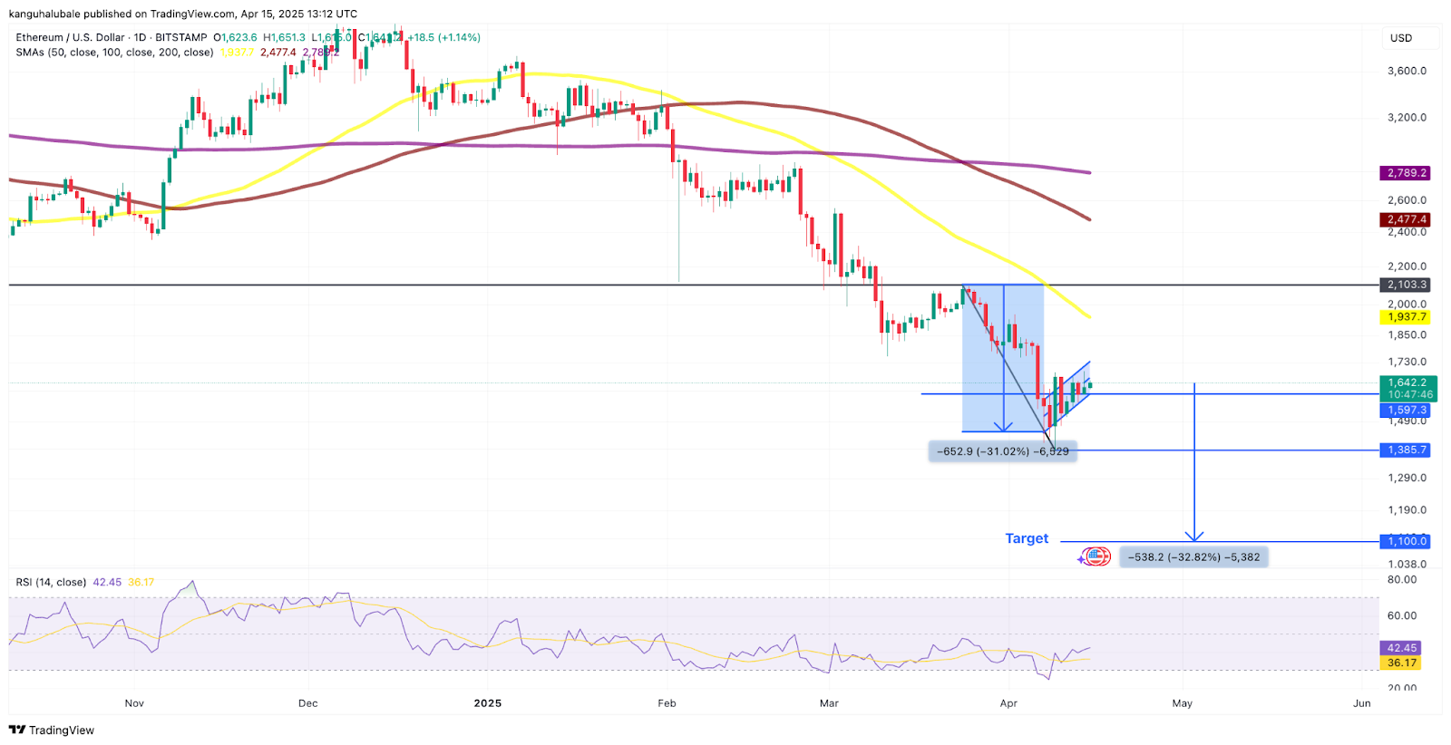 Ether’s (ETH) market is very close to hitting all-time lows as a classic bearish chart pattern hints at a deeper correction toward $1,100.