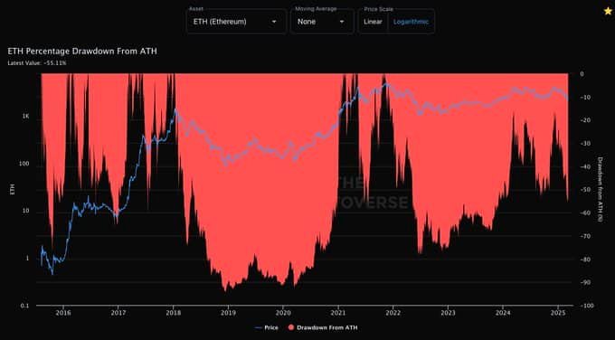 Ethereum’s price history reflected resilience in the latest percentage drawdown. During the 2022 bear market following the FTX collapse, ETH saw a sharp -80% decline.
