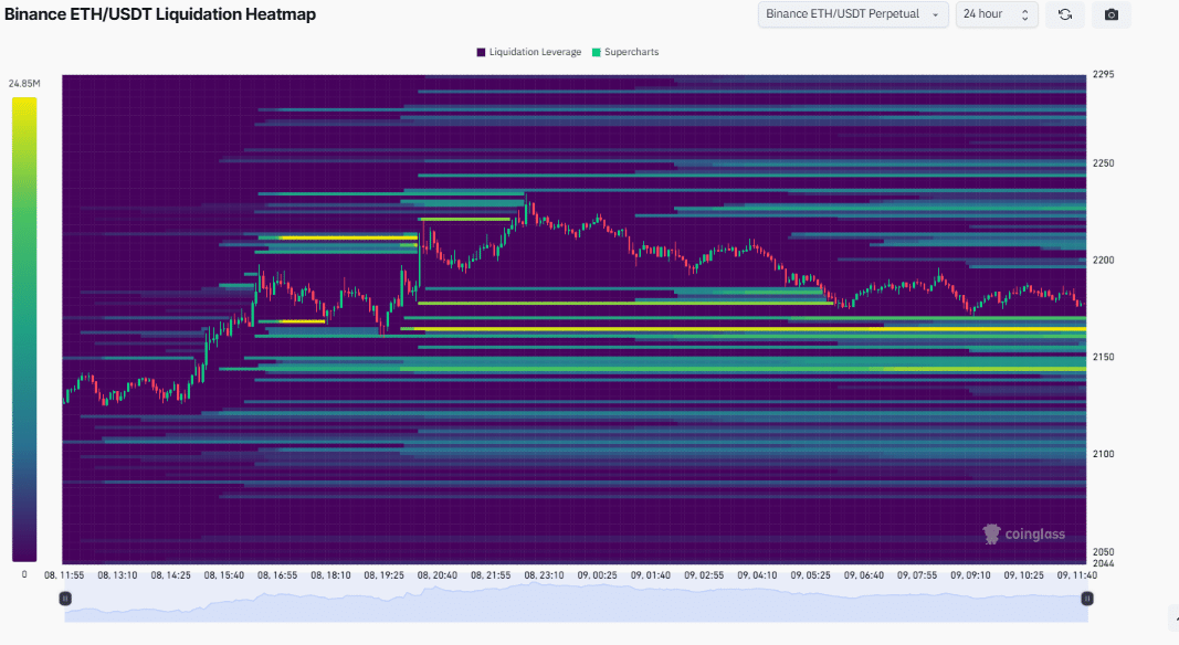 Ethereum’s resilience tied closely to the Binance ETH/USDT liquidation heatmap. Previously, the heatmap displayed ETH trading between $2,050 and $2,250 over a 24-hour perpetual frame.