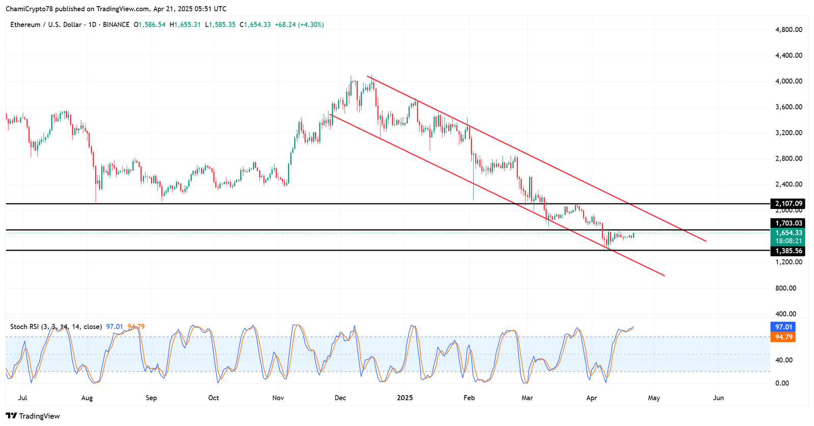 Ethereum has begun showing early signs of recovery after weeks of downward pressure, climbing by 3.62% in the last 24 hours to trade at $1,647.83 at press time. In fact, the asset rebounded strongly from the $1,385 support level to test the $1,650–$1,703 resistance zone.