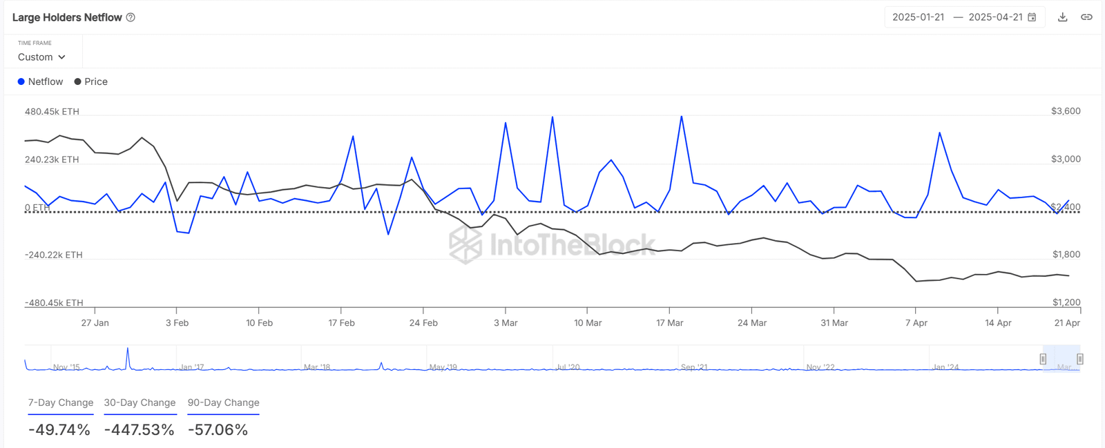 Simultaneously, large holders have pulled back significantly as well, with whale netflows plunging by 49.74% in the last seven days and over 447.53% across the last month. This could mean hesitation among institutional players, reducing Ethereum’s breakout potential.