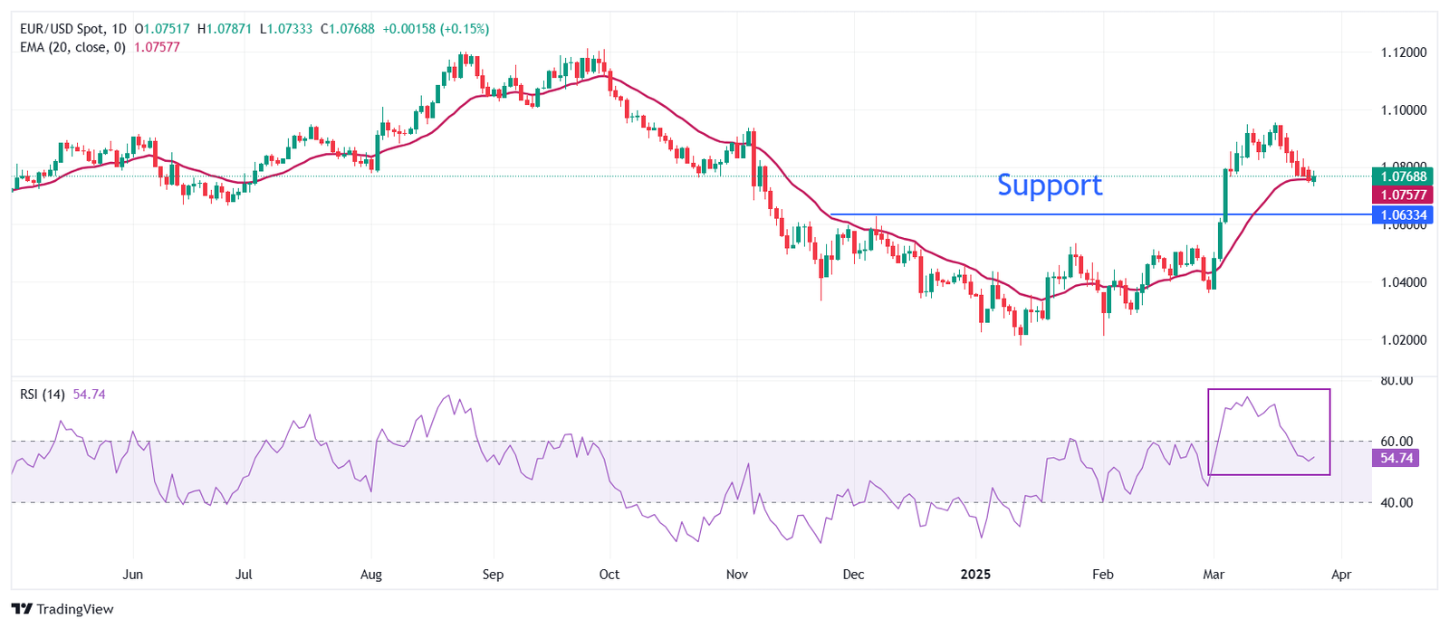 EUR/USD jumps to near 1.0800 in North American trading hours on Thursday. The major currency pair gains after a six-day losing streak despite deepening fears of a potential trade war between the United States (US) and the Eurozone. Fears of a trade war have escalated as the European Union (EU) prepares to announce retaliatory tariffs on the US against 25% auto tariffs imposed by President Donald Trump on Wednesday, which will come into effect on April 2.