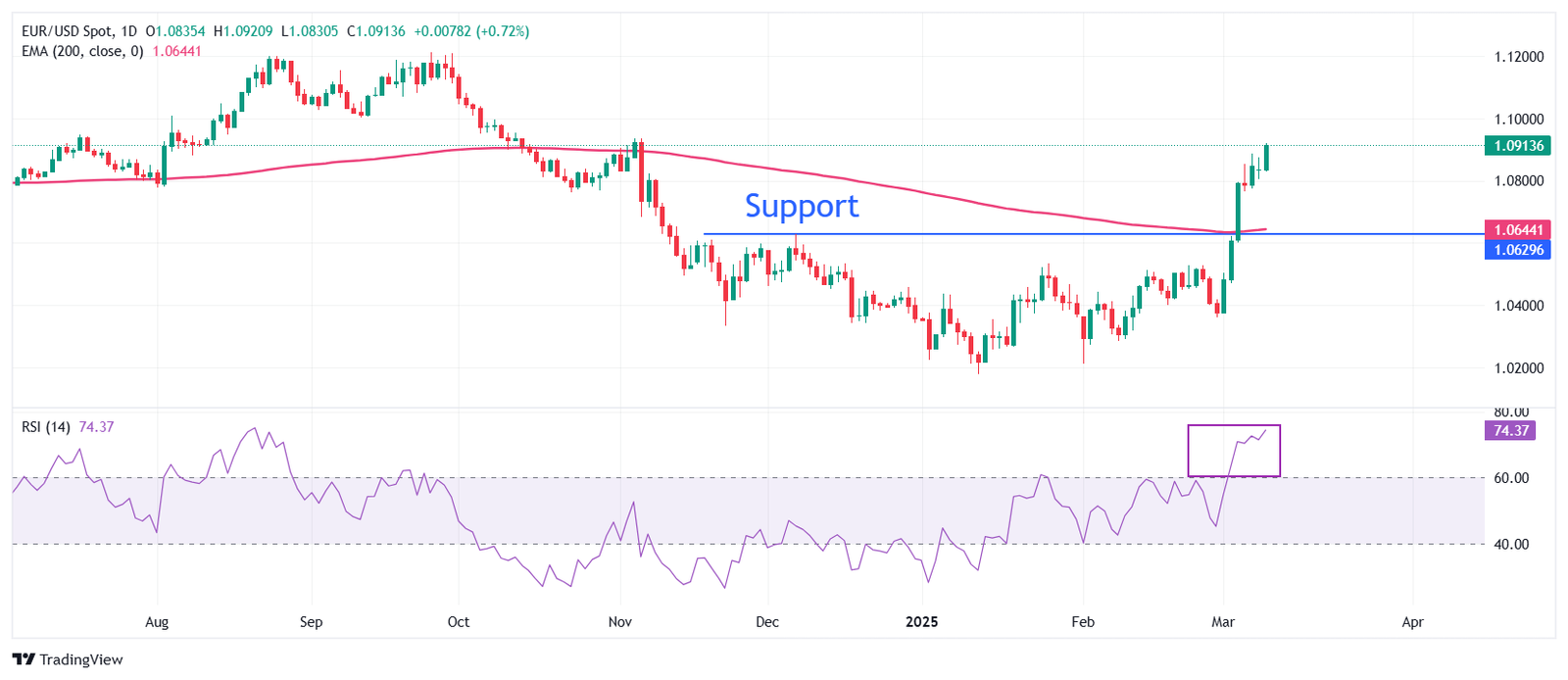 EUR/USD jumps above 1.0900 on Tuesday. The major currency pair strengthened after a decisive breakout above the December 6 high of 1.0630 last week. The long-term outlook of the major currency pair is bullish as it holds above the 200-day Exponential Moving Average (EMA), which trades around 1.0640.