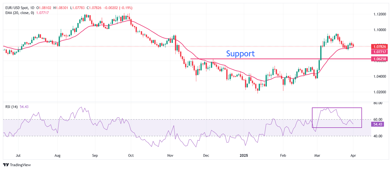 EUR/USD declines to near 1.0785 during the European trading session on Tuesday. The major currency pair slumps while the US Dollar (USD) steadies ahead of the release of reciprocal tariffs by United States (US) President Donald Trump on Wednesday. The US Dollar gains ground even though market participants anticipate Trump’s tariffs to deliver economic shocks as domestic importers will bear the burden of higher prices.
