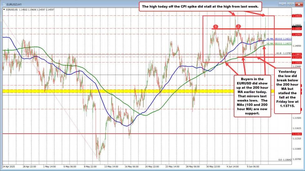 Despite the CPI-fueled momentum, the inability to breach resistance suggests caution. Buyers need to push through the 1.14935–1.1500 zone to target the next upside level at 1.1516, followed by the 2025 high at 1.1573 (from April 21, not shown). On the downside, a break below the MAs would expose the 1.1371–1.1378 area, with further support at last week’s low of 1.13556.