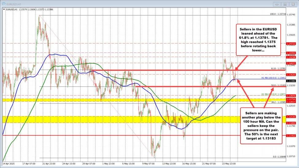 The EURUSD rally stalled just ahead of the 61.8% retracement level at 1.13781, with the high price reaching 1.1375 before rotating lower. Sellers stepped in at this key technical level, and the pair has since dipped back below the 100-hour moving average at 1.13451—a line that had previously supported the bullish bias (or at least stalled the selling). There have been breaks earlier today, but the selling stalled quickly. Can the sellers keep the momentum going now..
