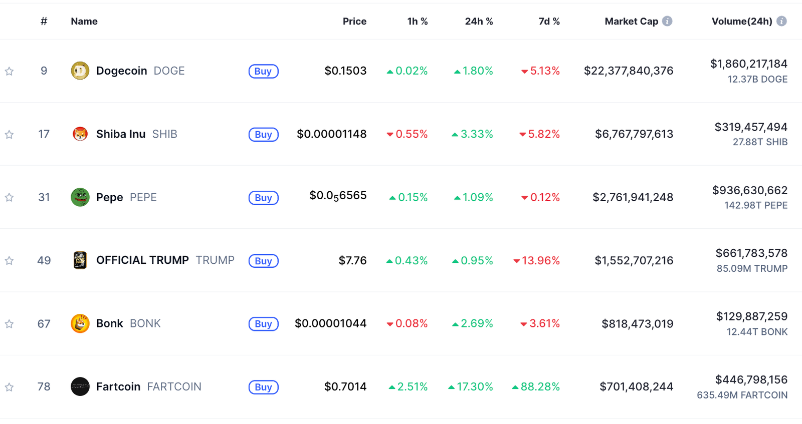 Top memecoins and their price and volume performances. Source: CoinMarketCap