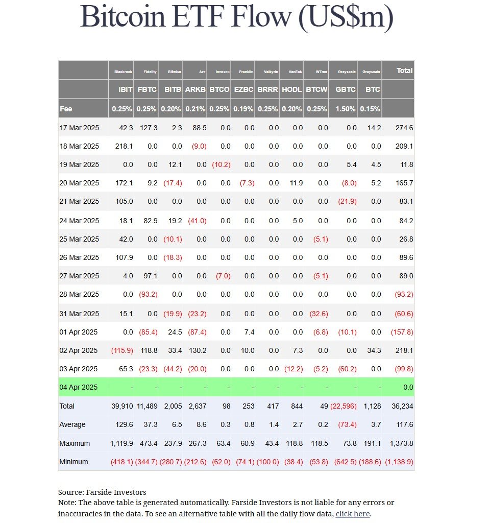 Spot BTC ETFs saw nearly $100 million in outflows on April 3 amid the heightened market volatility following US President Donald Trump’s tariff announcement of sweeping tariffs on April 2.