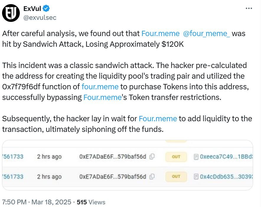 “Subsequently, the hacker lay in wait for Four.Meme to add liquidity to the transaction, ultimately siphoning off the funds,” ExVul added.