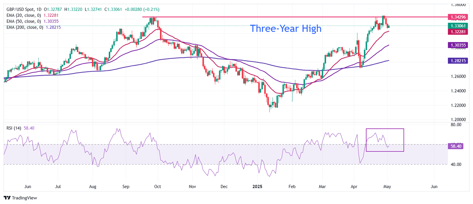 The Pound Sterling (GBP) is off from the day’s high of 1.3320 against the US Dollar (USD) in Friday’s North American session. The GBP/USD pair pares some of its intraday gains as the US Dollar bounces back after the release of the upbeat United States (US) Nonfarm Payrolls (NFP) data for April. The US Dollar Index (DXY), which tracks the Greenback’s value against six major currencies, rebounds from the intraday low of 99.60.Read More…