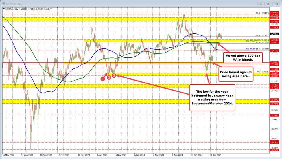 Zooming into the hourly chart, early-day price action saw a bounce in GBPUSD following the Trump tariff news, which triggered a wave of buying. The initial move higher tested the 100-hour moving average near 1.2922 (blue line on the chart), where sellers initially leaned in. However, the downside was limited, and once the price broke above the 100-hour MA, bullish momentum carried it through the 200-hour MA as well.
