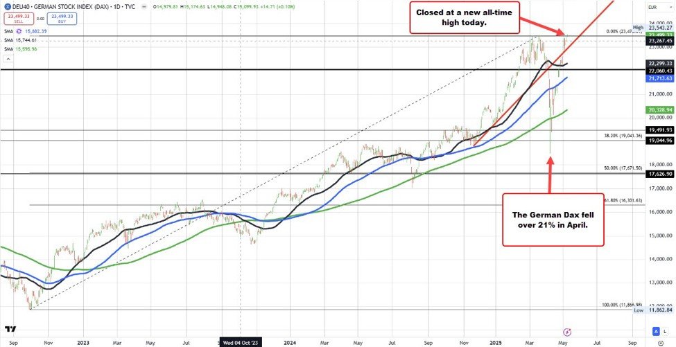 The German DAX has completed its lap from the March 6 high to the April 7 low and back to the March 6 high. We run to the downside was a -21.245% decline