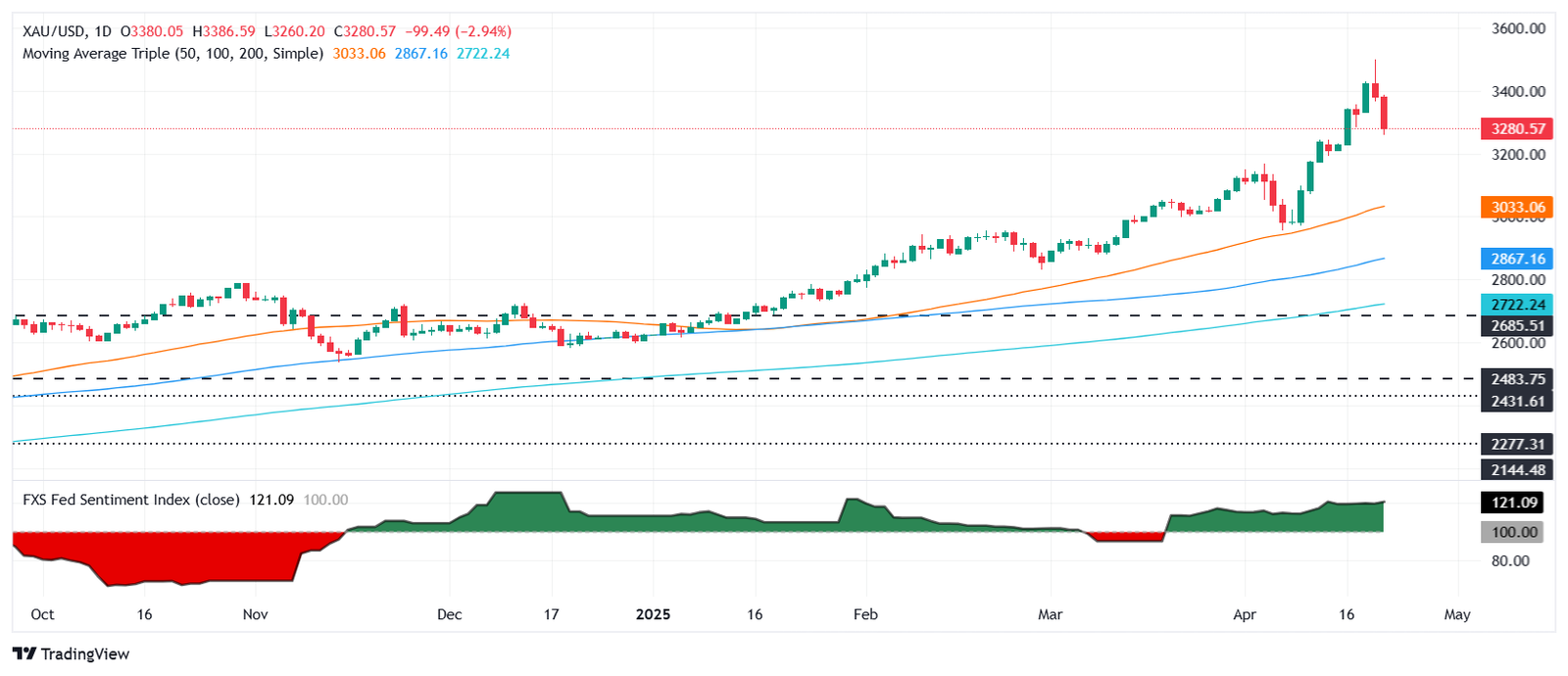 Gold remains upward biased despite the ongoing pullback driving the yellow metal below $3,300 a troy ounce. Although it seems that sellers are in charge, they need to drag XAU/USD below the April 3 peak of $3,167, so they could test the next key support level, being the 50-day Simple Moving Average (SMA) at $3,032.