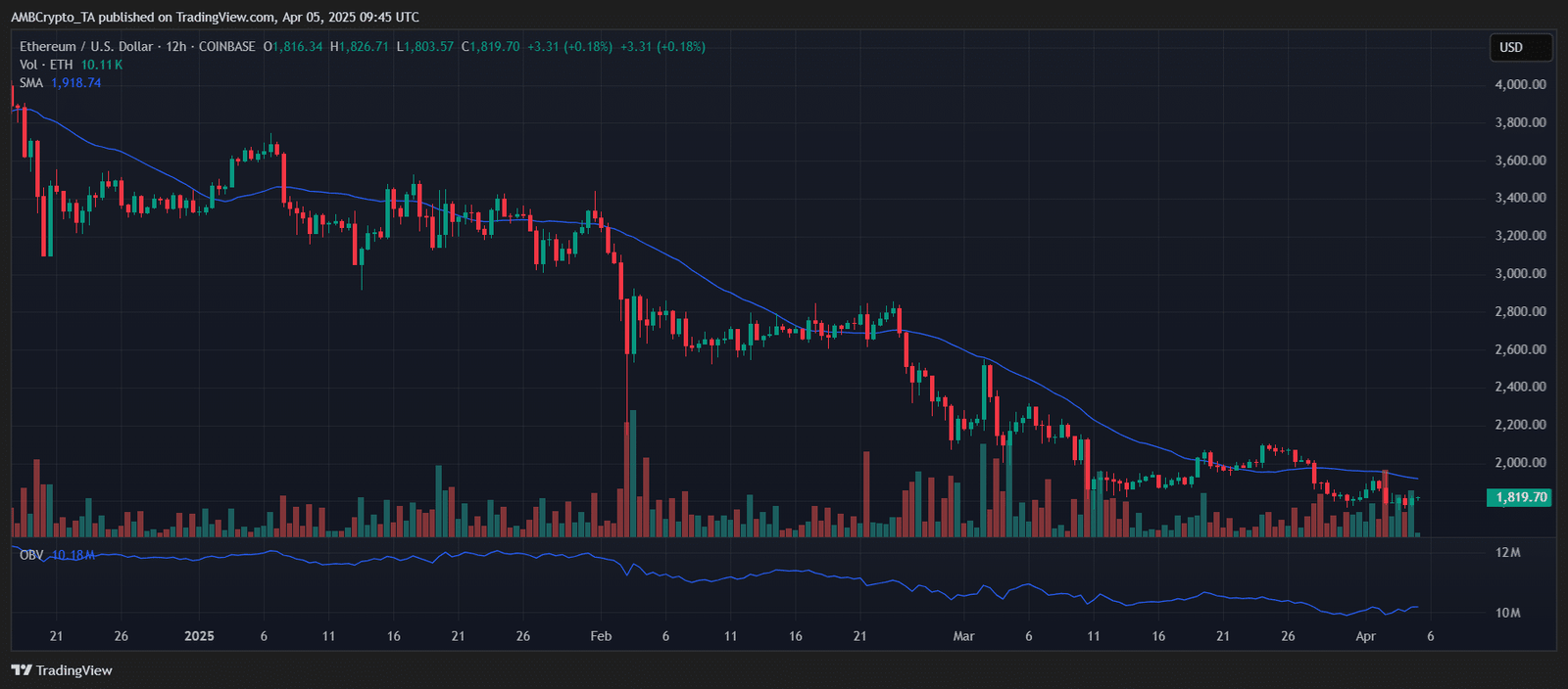 Though price didn’t rally, the spike reflects buyers attempting to absorb sell-side pressure. By the 1st of April, that volume had dropped to $4.75 billion, with ETH priced at $1,905.17.