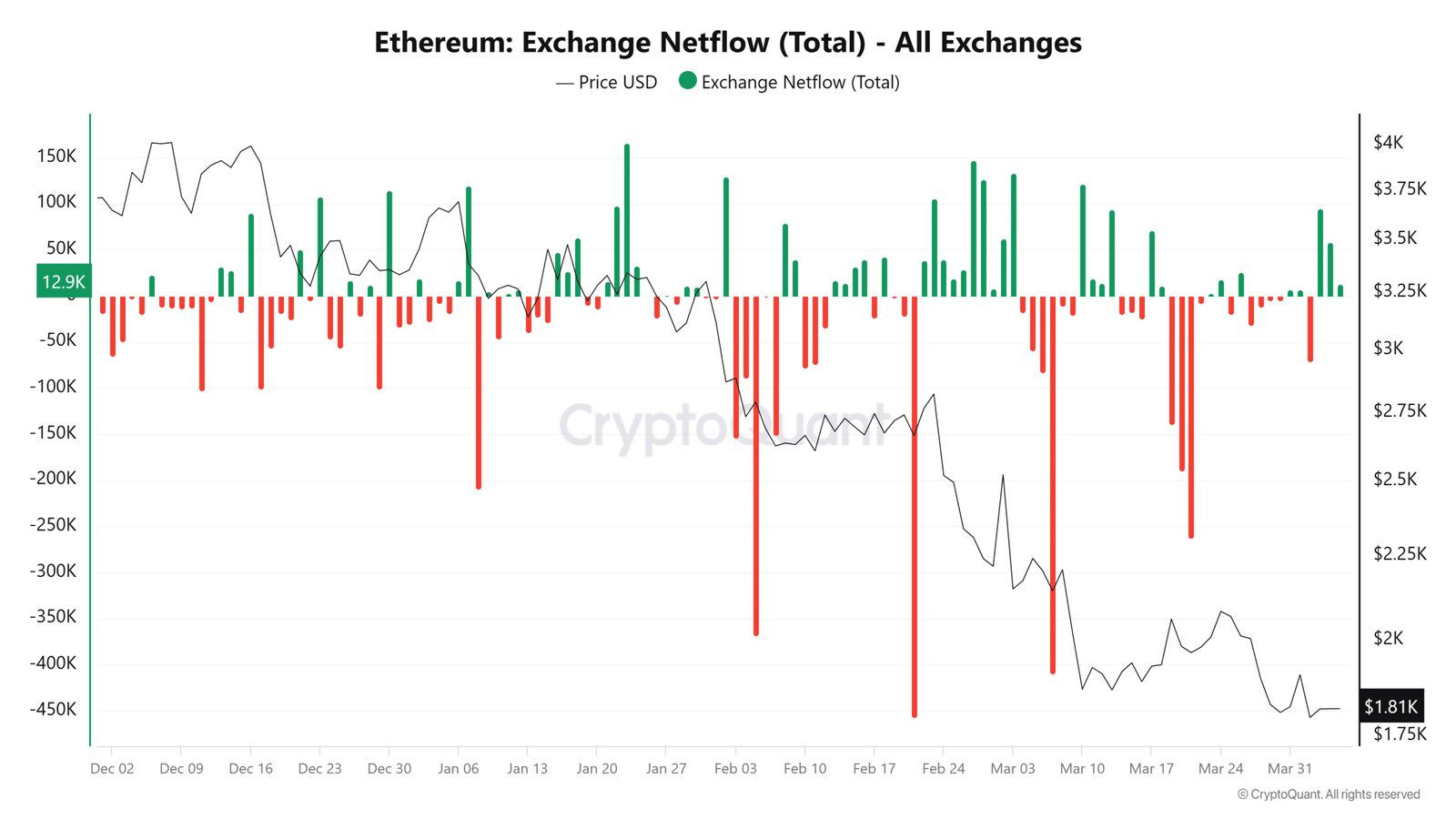 From December to March, while ETH tumbled 45%—from $3,278 to $1,810—withdrawals from exchanges increased.