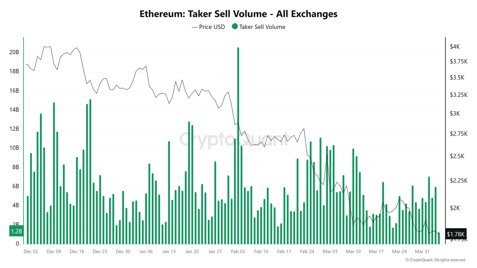 Sell volumes for Ethereum reached $601.6 million at the end of December and surged to $17.6 billion in early February. However, by the 1st of April, they had significantly cooled to approximately $4 billion, indicating a decline in panic-driven sell-offs.