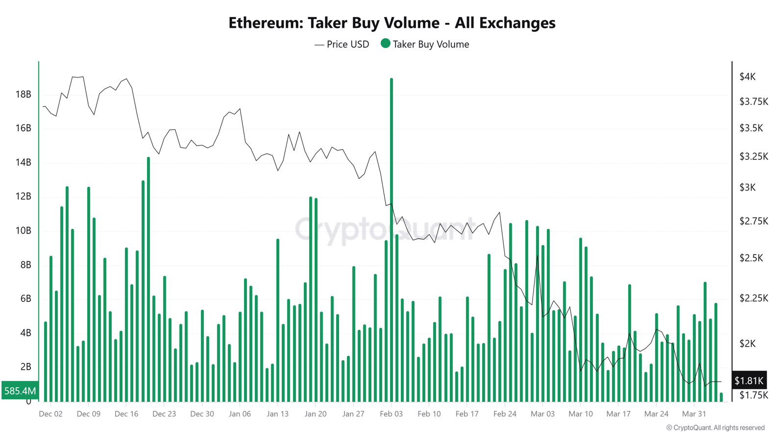 For example, on the 3rd of February, the Taker Buy Volume hit $19 billion as ETH hovered around $2,882.93.