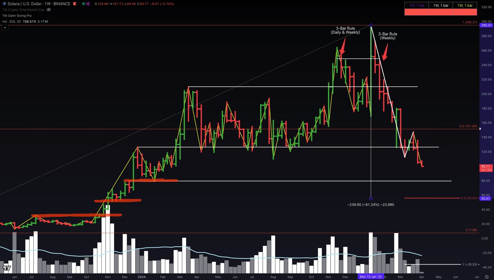Turning to layer-1 smart contract platform Solana (SOL), Pizzino refers to the 3-bar rule – which aims to spot trend reversals or continuations based on the behavior of the previous three closing prices – to suggest a Solana crash to $60.