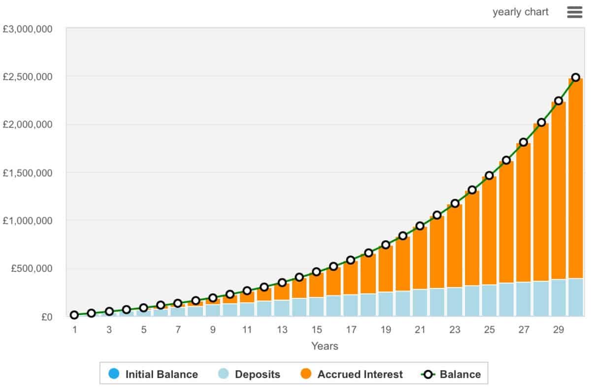 There are lots of ways to reach the same outcome. However, here’s one way of running the maths. Let’s assume monthly contributions of £1,100, or £13,200 annually over 30 years, and a 10% annualised return. At the end of the period, an investor would have a little more than £2.4m. Of course, not everyone can achieve a 10% annualised return over the long run. Although, many investors have done so simply by investing in index tracking funds.