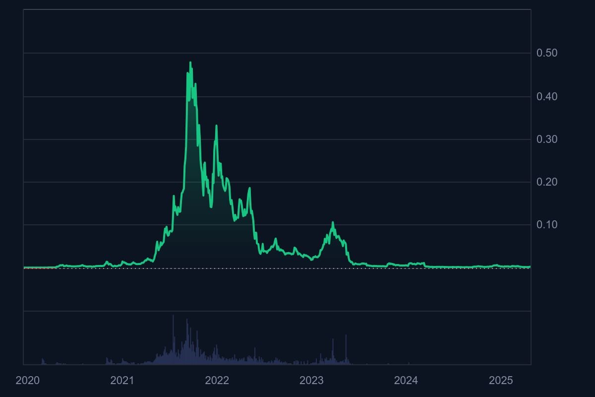HEX’s price spiked in 2021 before nearly falling off by early 2023. Source: CoinMarketCap